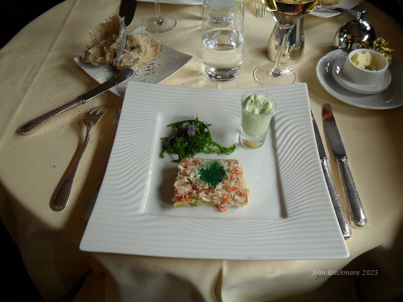 starter: Presskopf de tourteau sur une gelée de pomme verte, crème de ciboulette