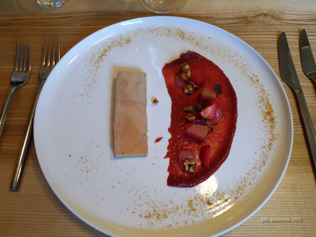 Foie Gras de Canard du Gers, Chutney Fraises et Rhubarbe / Noisettes