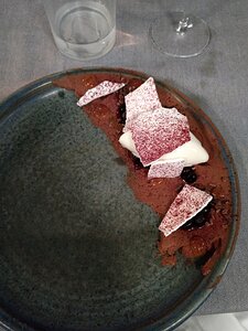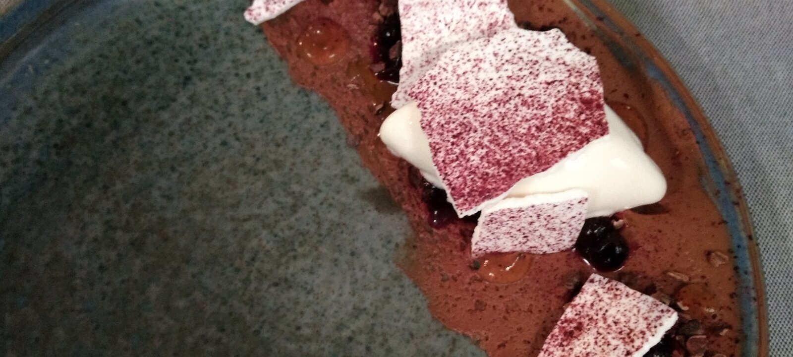 Chocolate mousse, white ice cream, blackcurrants, spring honey, Sevablodda