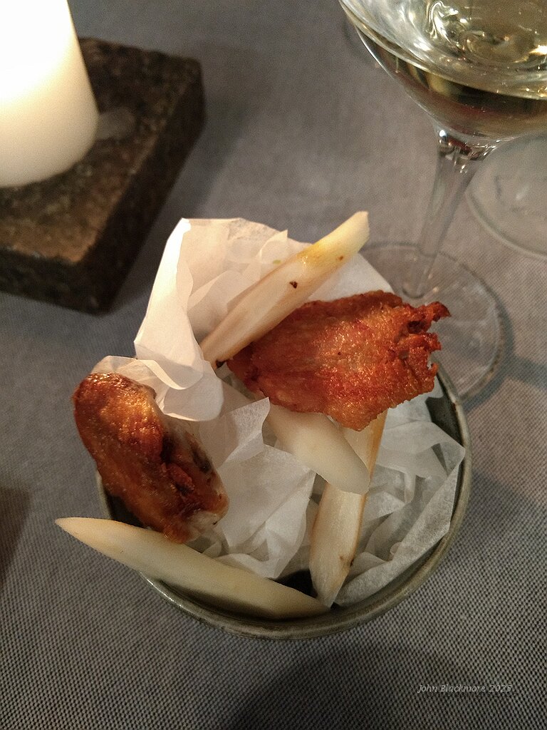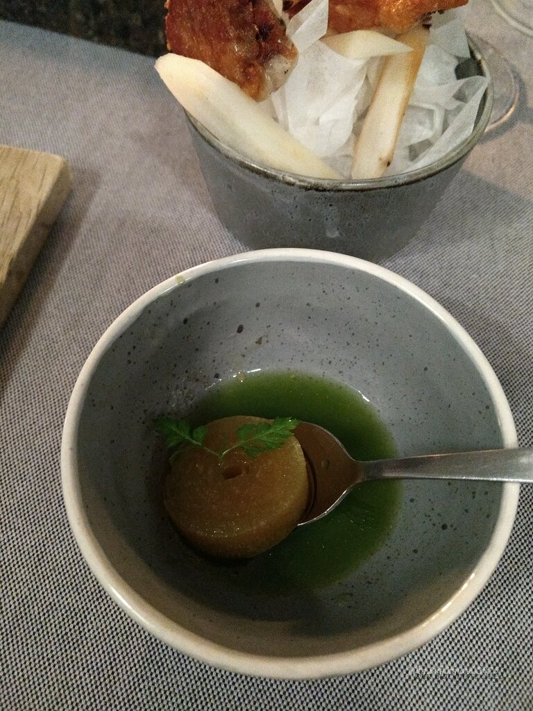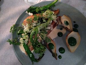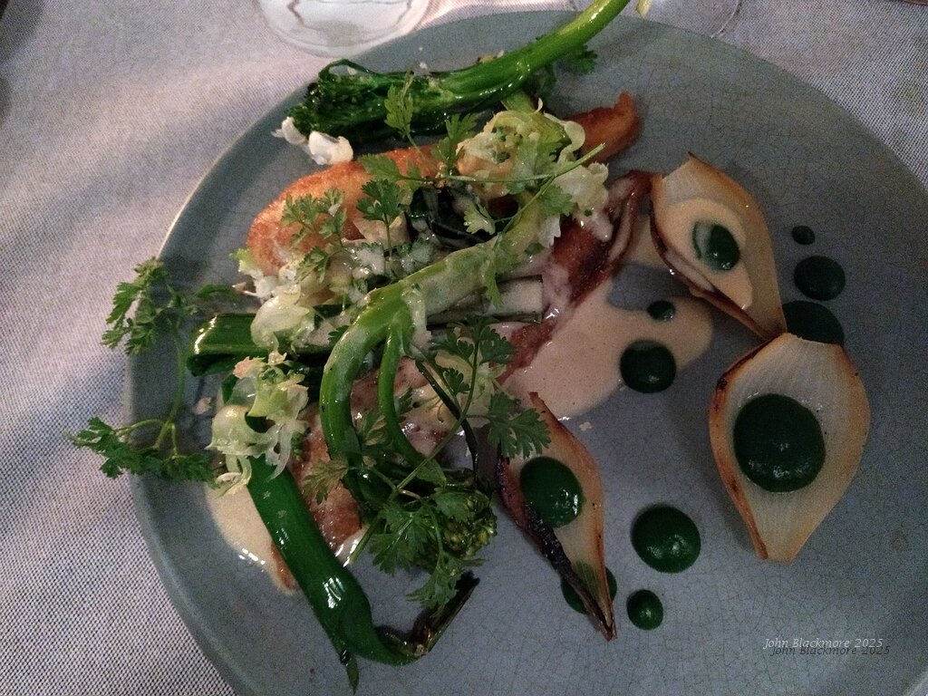 Torbay sole, broccoli, spring onions, onions, white cream and cod juice