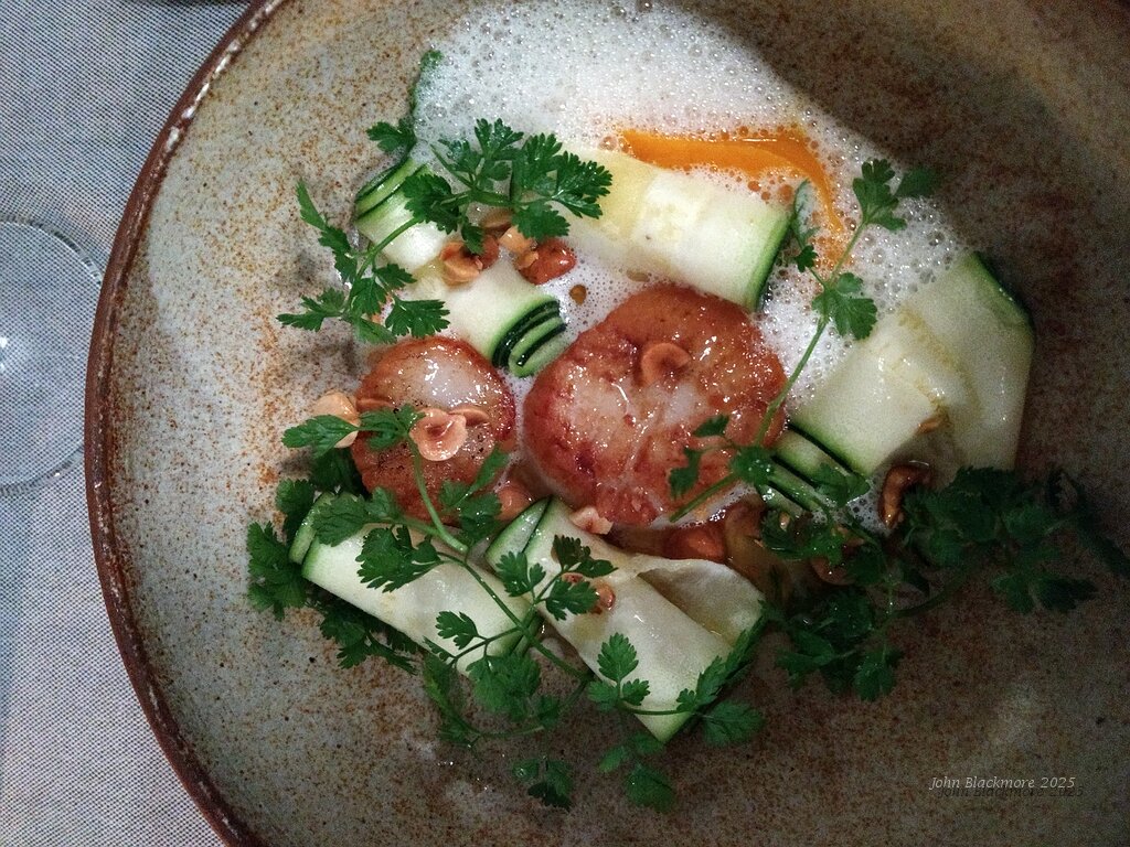 Scallops, rolled courgette slices, butternut squash puree, caramelised butter with hazelnuts, parsley