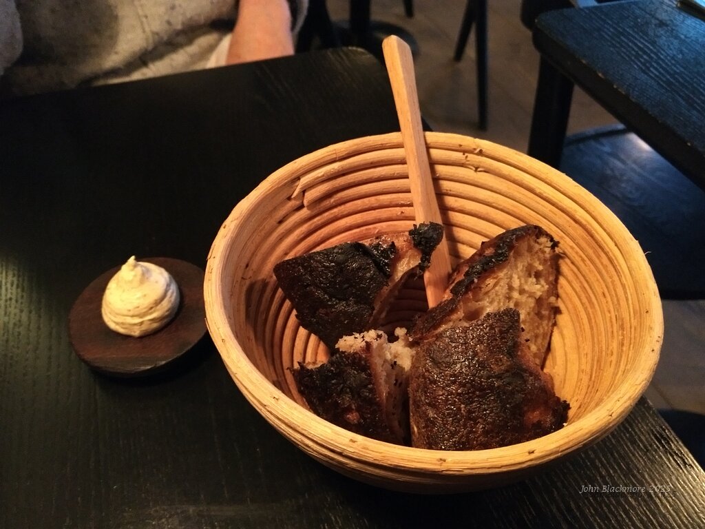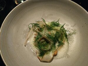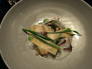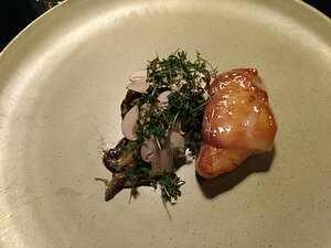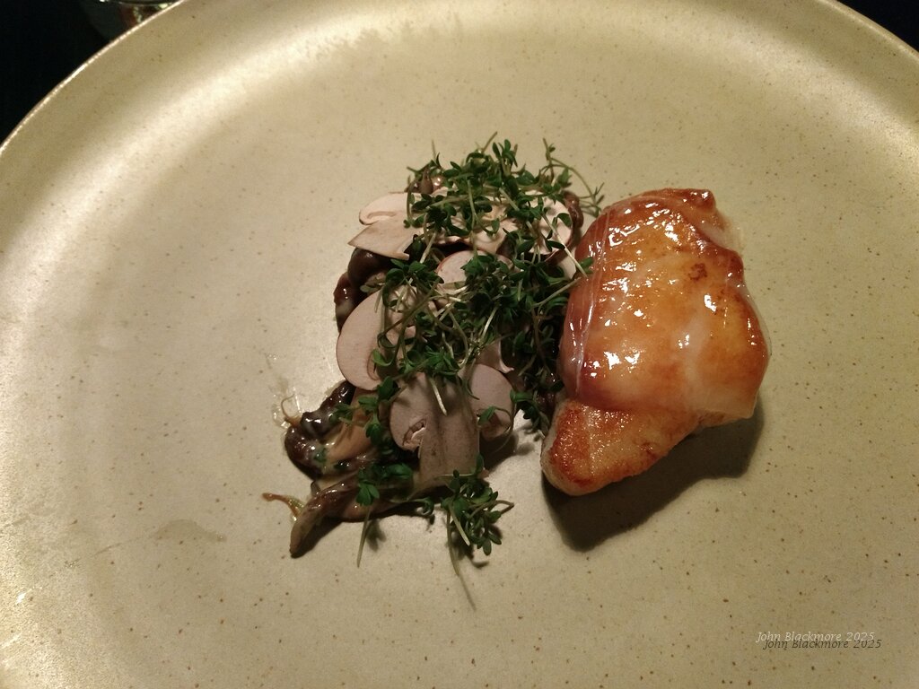 Monkfish wrapped in pine-smoked lardo, mushroom, cress, cream