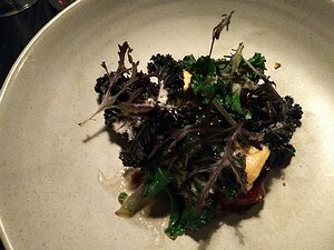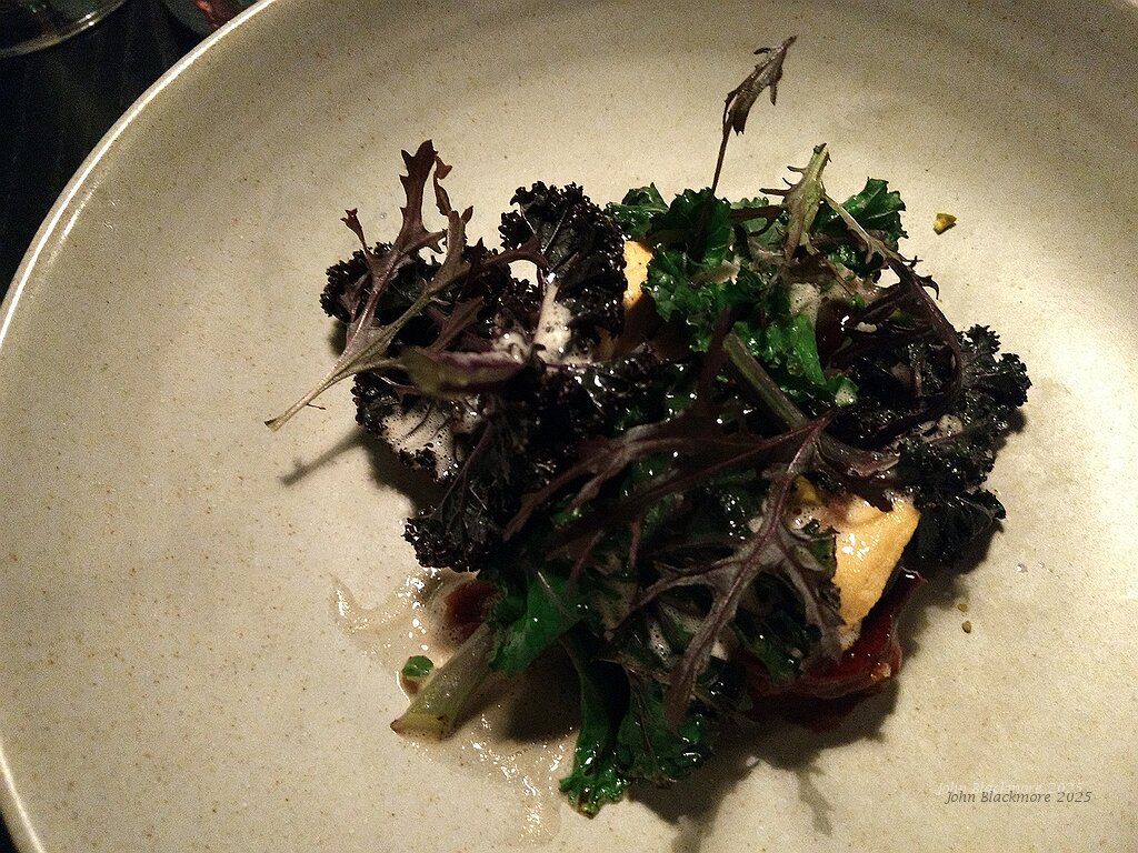 Pork cheeks, curly kale, apple, mustard seeds, mustard cream, pistachio nuts