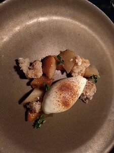 Jerusalem artichoke, French toast, pear, vanilla ice with chocolate dust and thyme