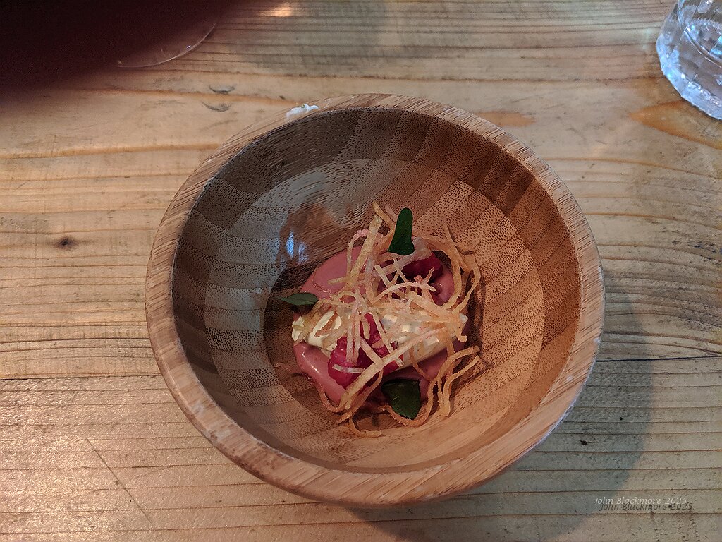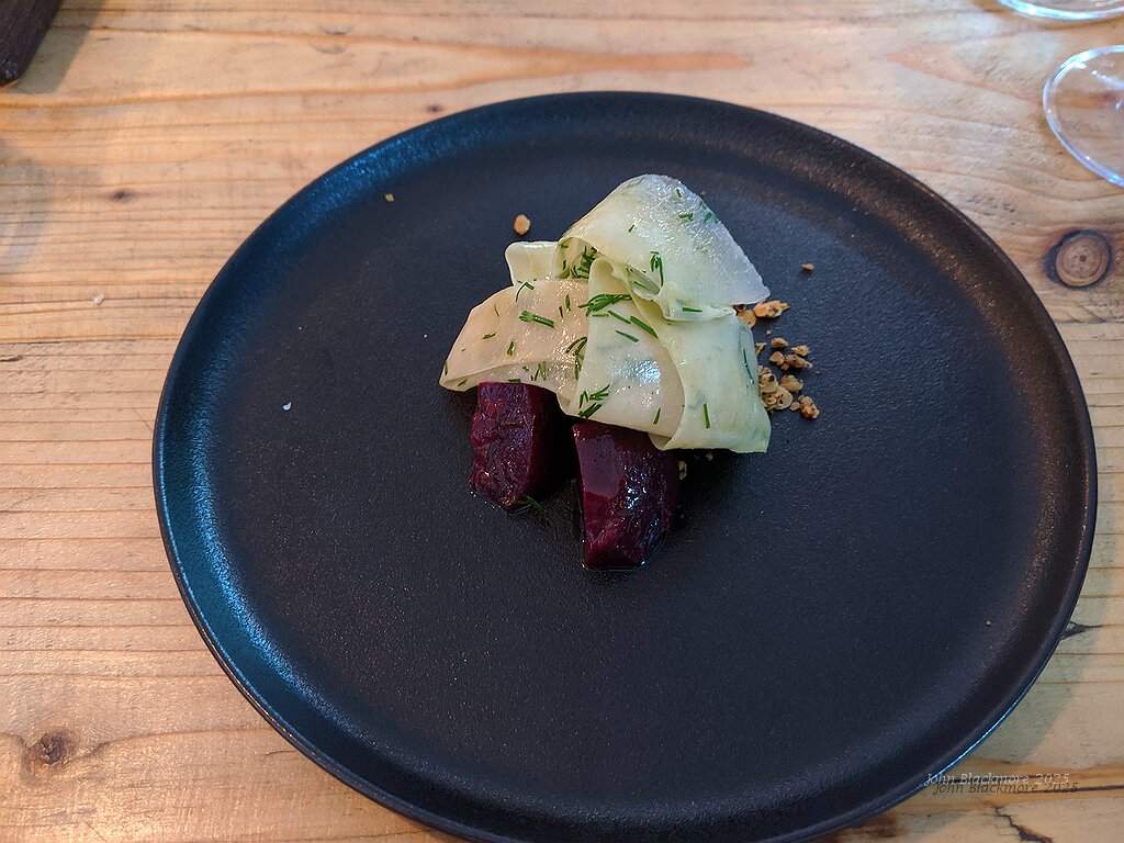 Beetroot, Cheese, Blueberry (kohlrabi strip with dill and granola)