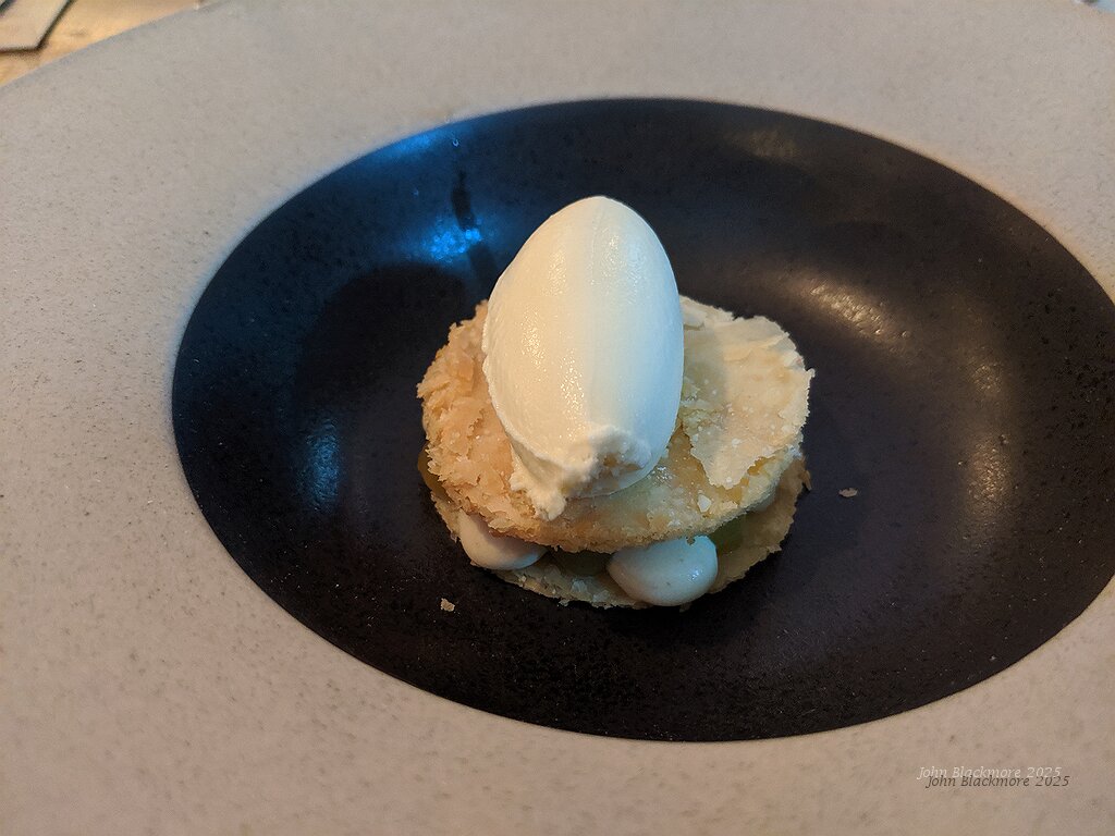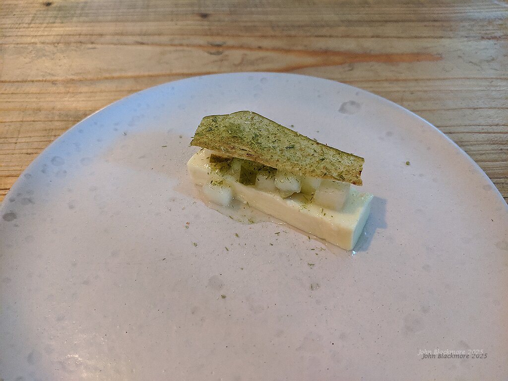 Celeriac, Scallop, Asparagus (celeriac disc with scallop on top, asparagus cream and a sprinkling of wood ants)