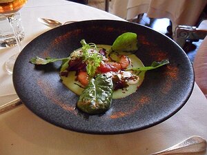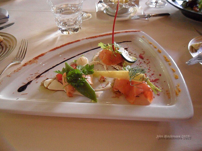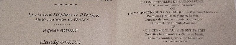 starter: les petits pannequets de homard en fines feuilles de saumon fume, une creme mousseuse de wasabi