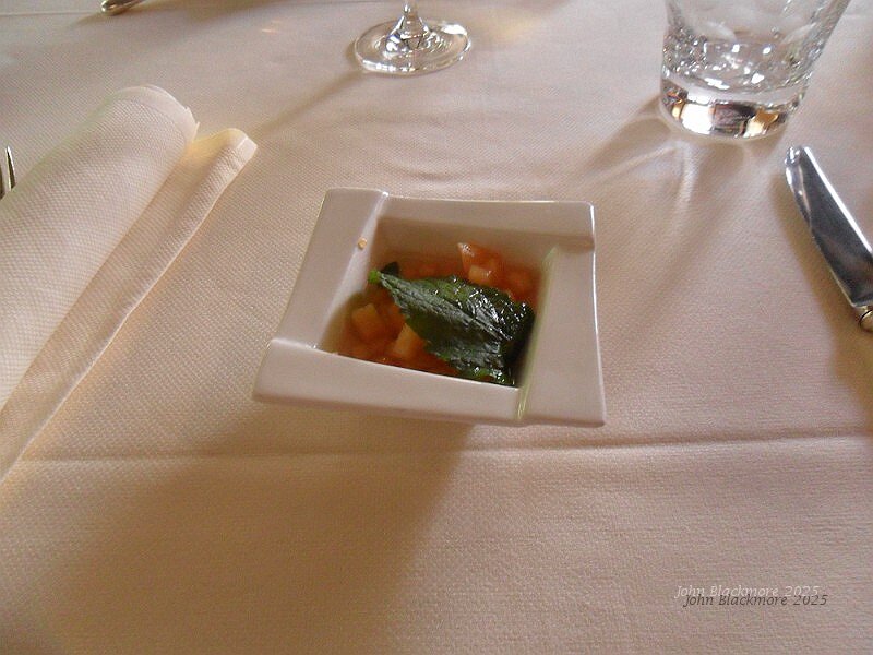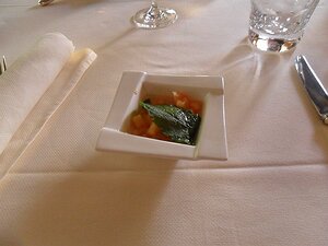 starter: une creme glacee de petits pois, crevettes bio marinees a l'huile de basilic, tomates confits, reduction balsamica