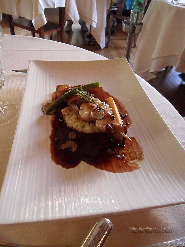 Main: une brochette de lapeau et foie gras poele, risotto a la truffe d'ete, asperges verts, une sauce "tuber Eastium"