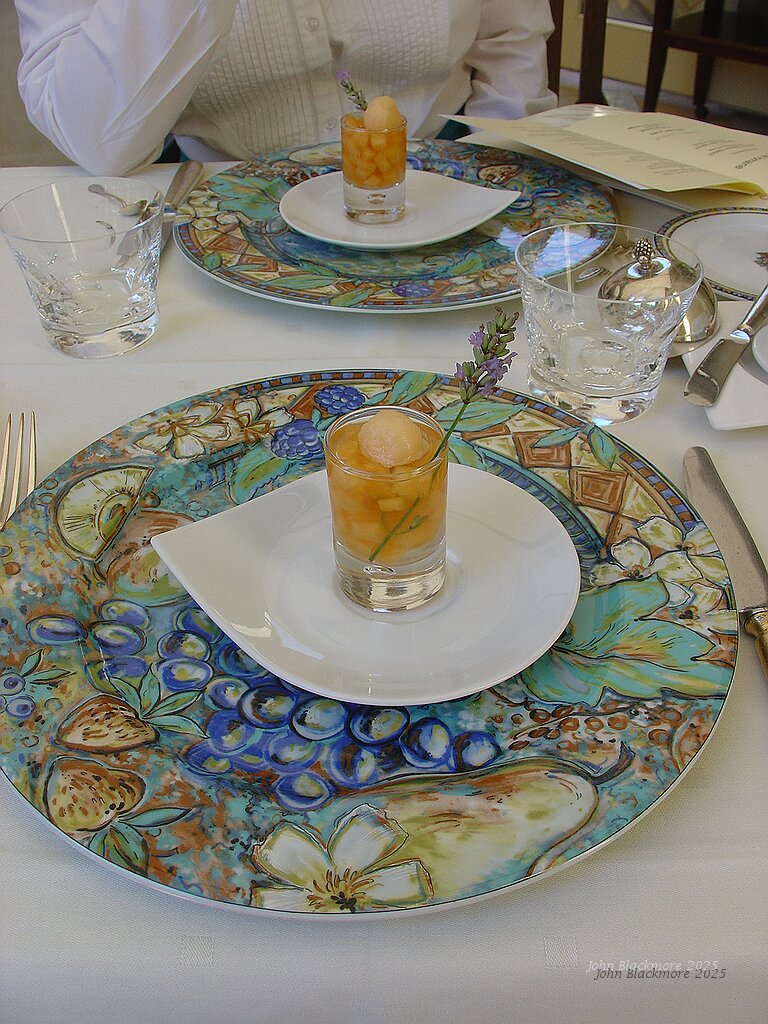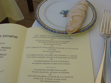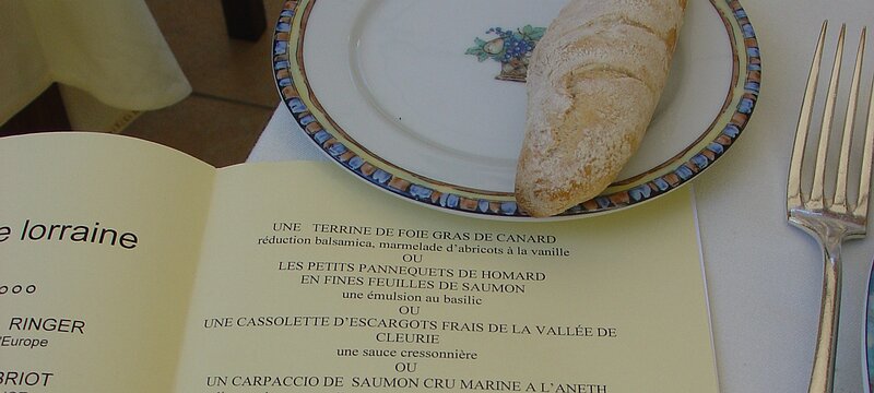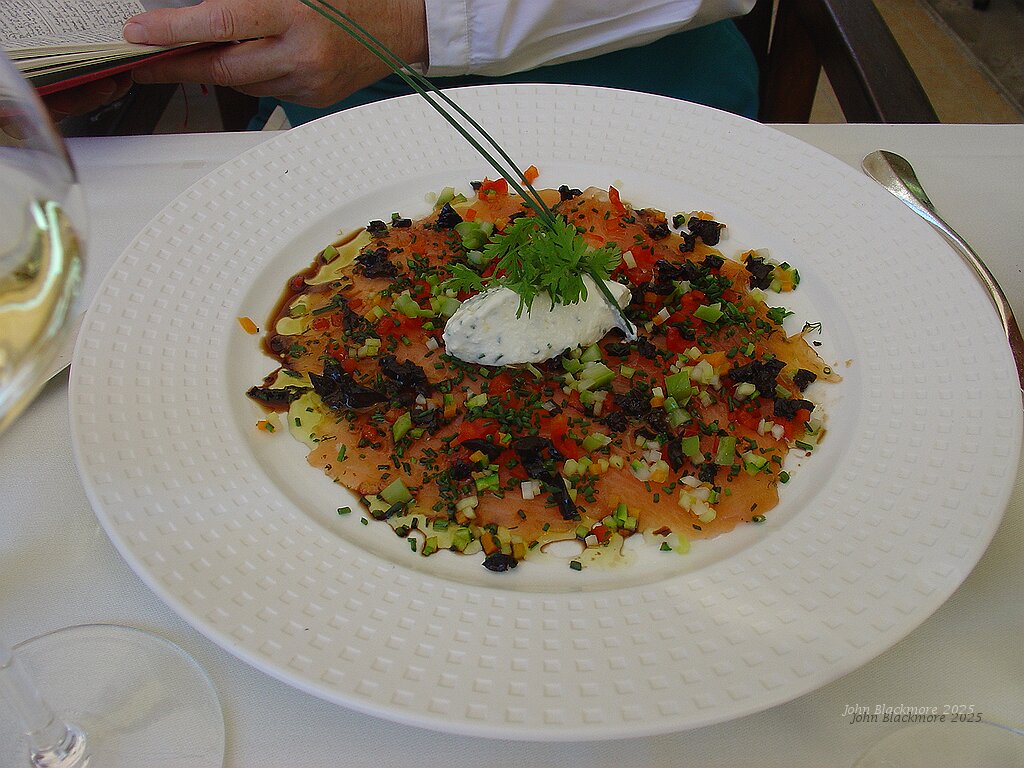 Un carpaccio de saumon cru marine a l'aneth, olives noires et pequilos, faissele de fromage blanc aux herbes