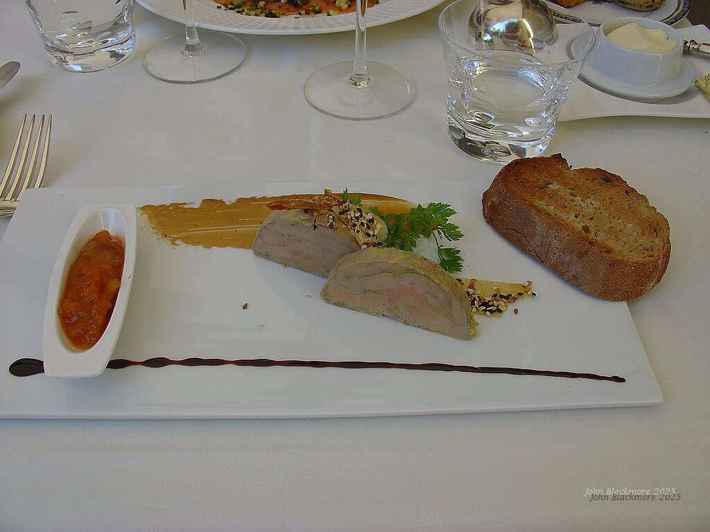 Une terrine de foie gras de canard, reduction balsamica, marmelade d'abricots a la vanille