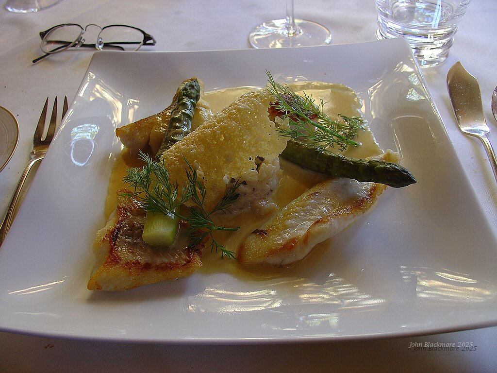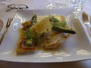Main: Un risotto de poissons fins, bar, sole, sandre, Saint Jaques, asperges vertes, une jus iode