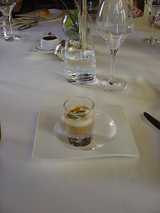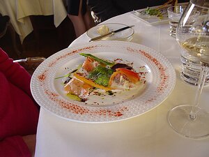 20101026_DSC00847_DSCV1 Starter: les petits pannequets de homard en fines feuilles de saumon fume, mousse wasabi, une émulsion coraillée au basilic
