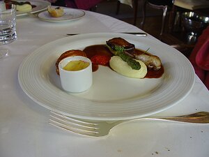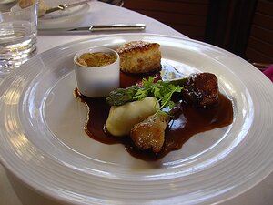 20101026_DSC00851_DSCV1 Main: une dinette de pigeon de Colombier, filet rose, la cuisse confite, la tourte, le hachis, un jus au vieux Porto