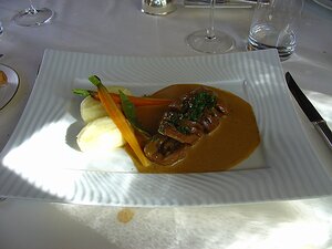 Main: une dinette de pigeon de Colombier, filet rose, la cuisse confite, la tourte, le hachis, un jus au vieux Porto