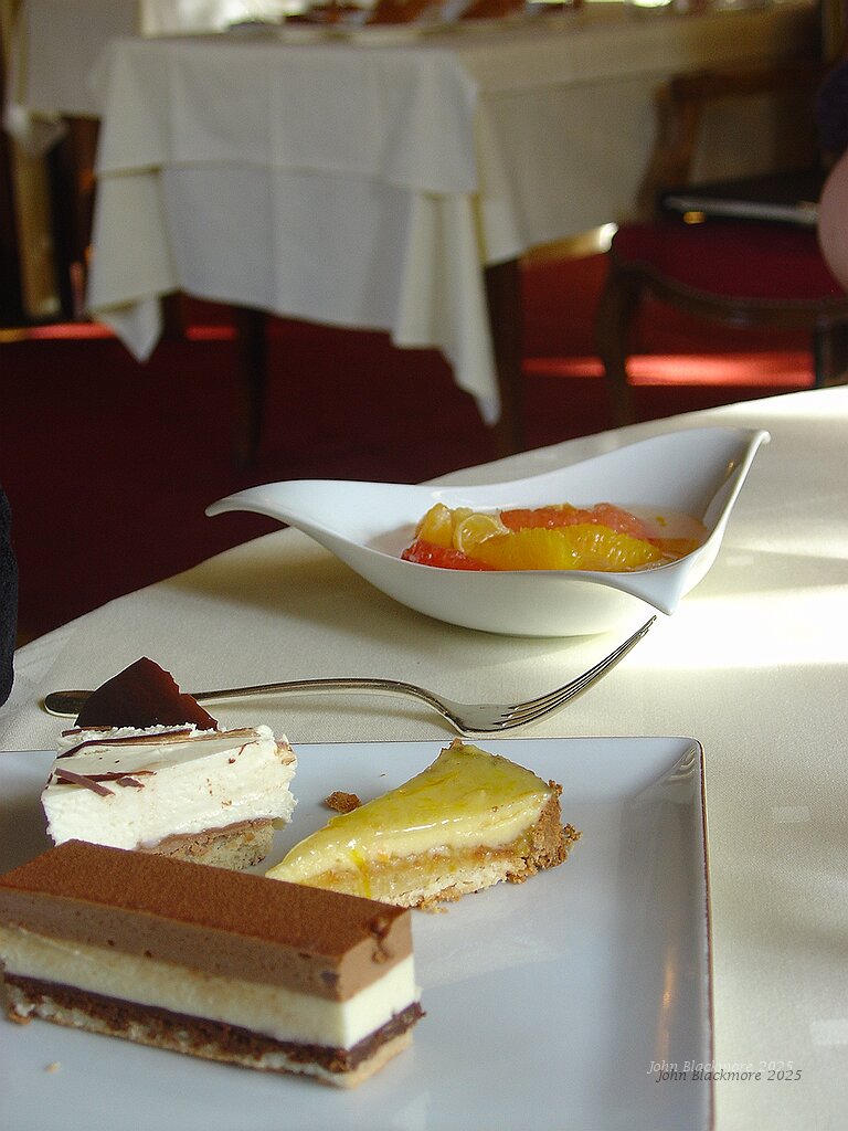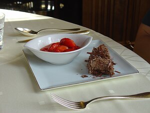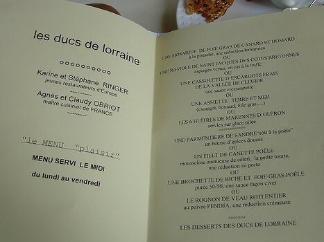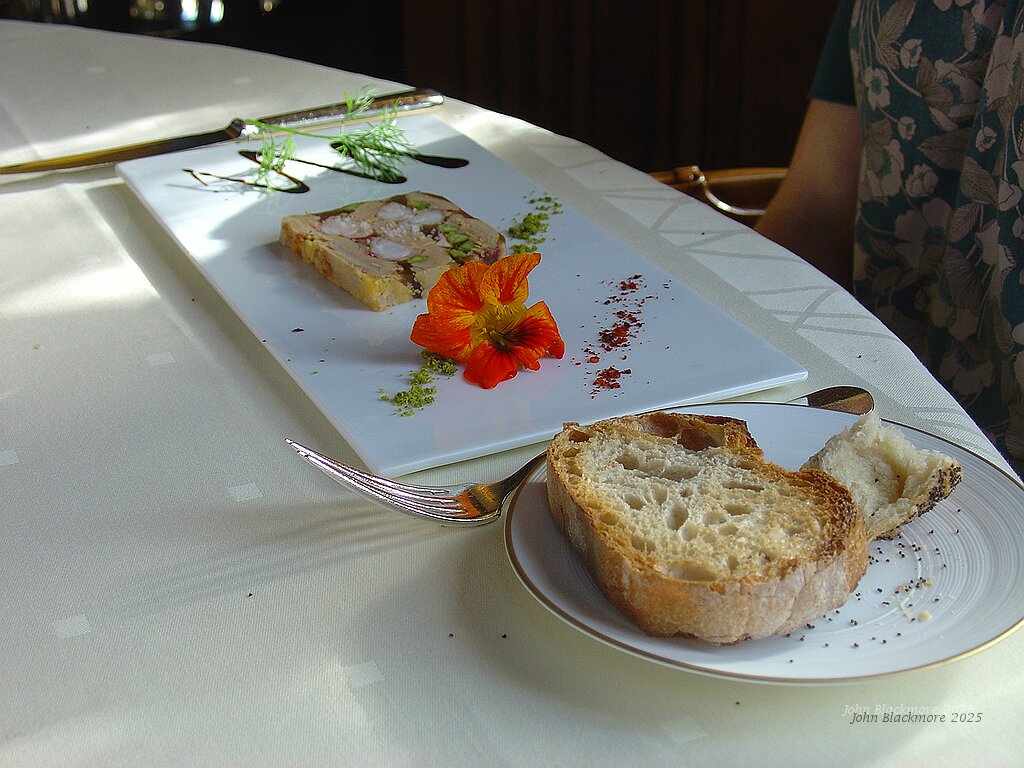 Une mosaique de foie gras de canard et homard a la pistache, une reduction balsamica