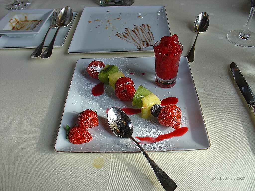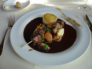 Une brochette de biche et foie gras poele, puree 50/50, une sauce facon civet