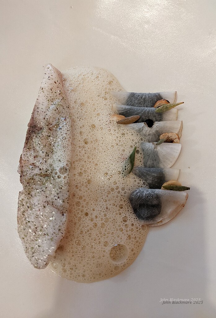 loup de mer Méditerranée cooked over the fire, stuffed turnip, purslane, hazelnuts, crustacean foam