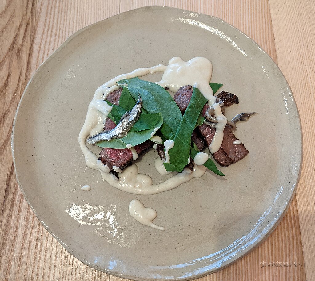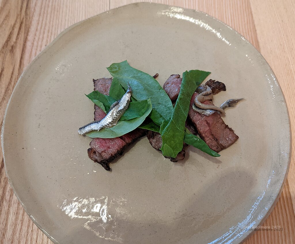 Wagyu beef cooked over the fire, anchovy, sorrel with ...