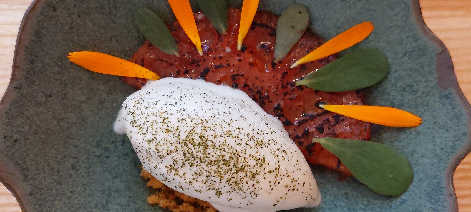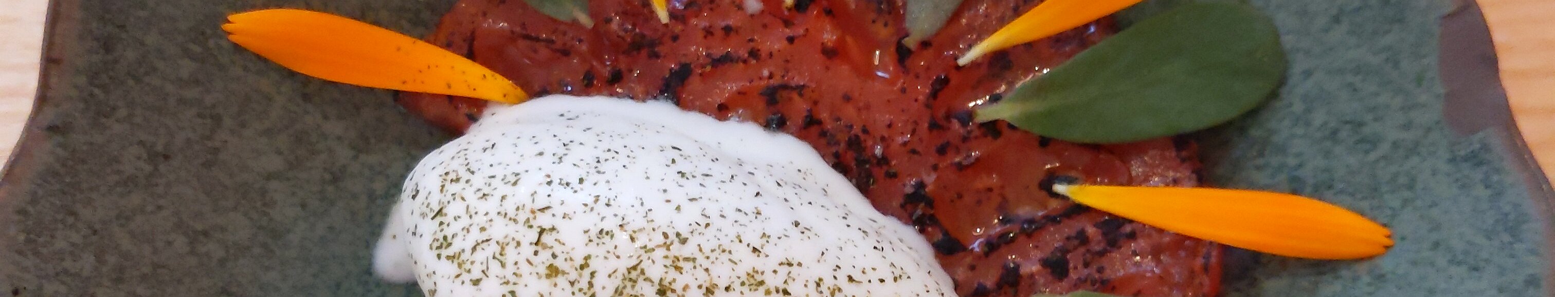 first meat course: beef gravlax with nasturtium
