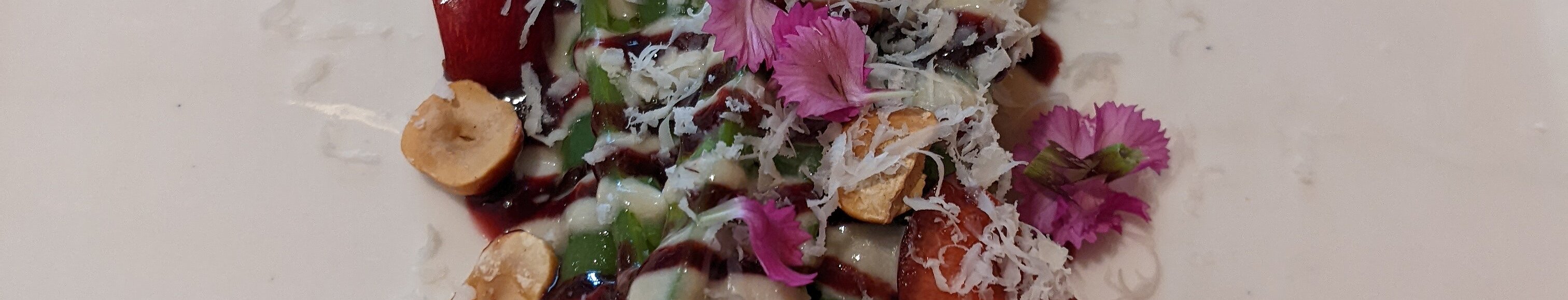 Black mullet cooked over the wood fire, cucumber à la grecque, cucumber, strawberries, strawberry coulis, nasturtium served with a yoghurt and mint sauce
