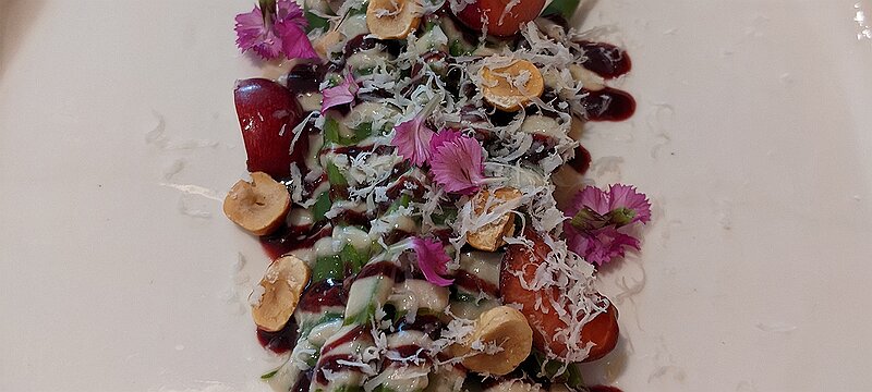 green bean salad with cherries, hazelnuts. cherry vinegar and sugar sauce, sauce césar with anchovy, topped with grated goats cheese