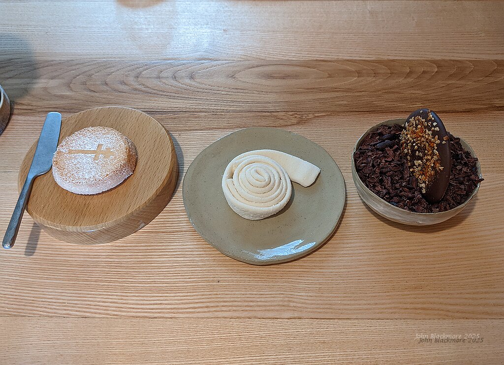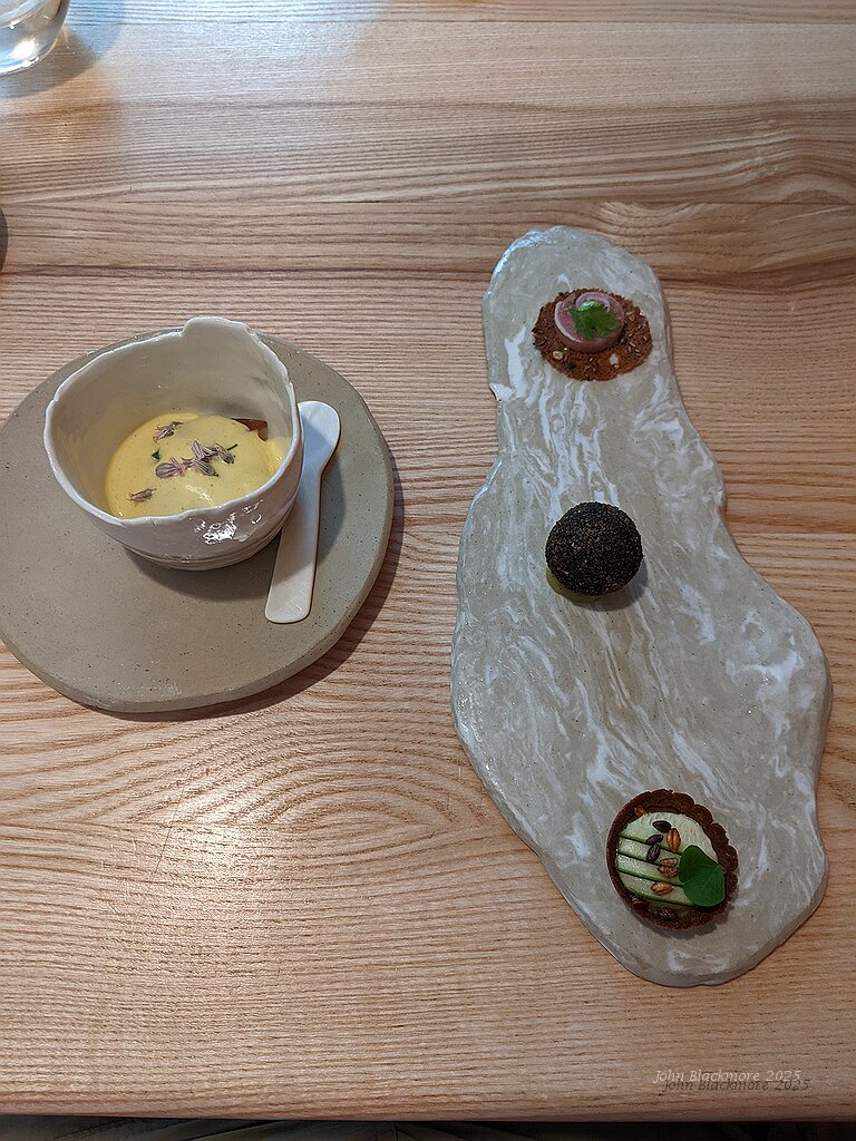 left: pommes nouvelles au jaune d'oeuf ciboulette, thon rouge fumé