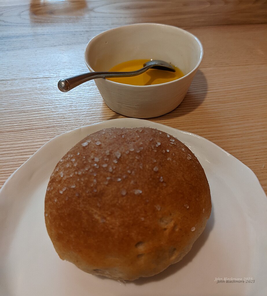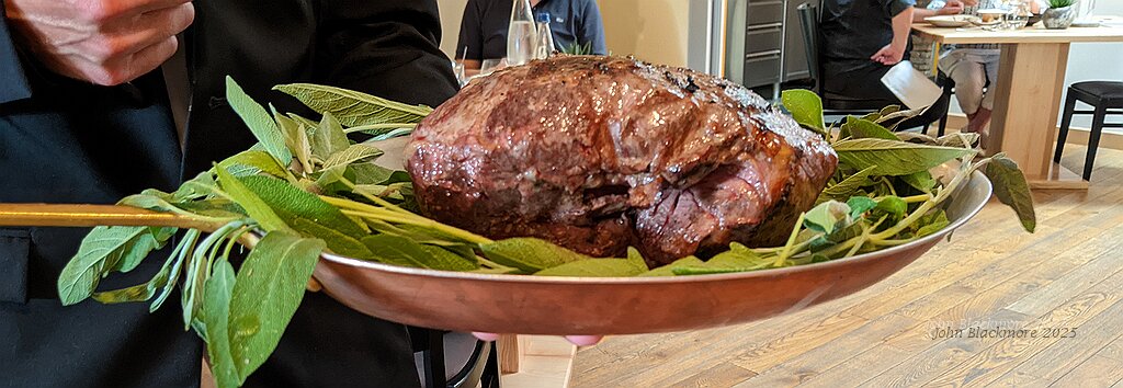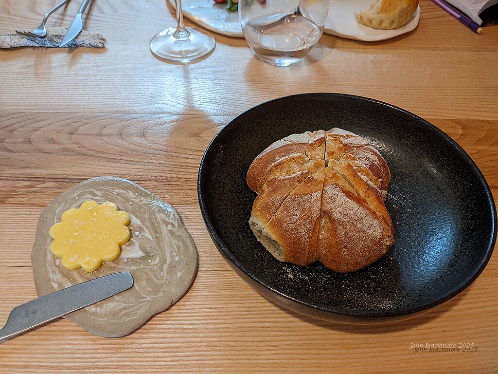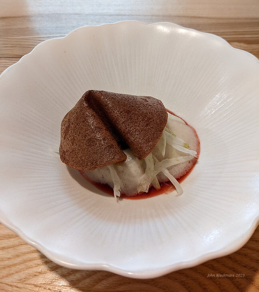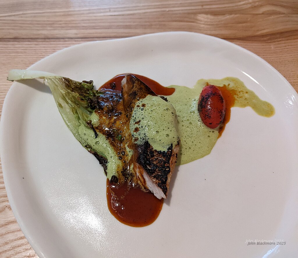 Dorade marinaded for several days, fire-charred leaf and tomato, goats milk sauce and a brown fish sauce