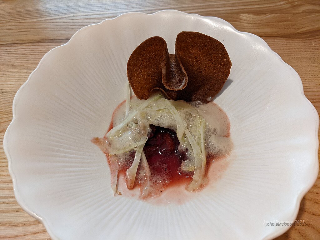 strawberries and pepper in red wine, elderflower mouse, fennel and gavotte (crepe)