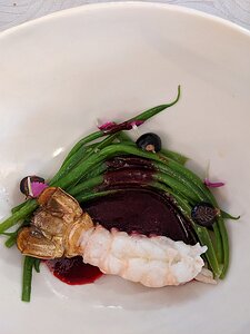 first course: Norwegian prawn with bacon, green beans and blackcurrant sauce
