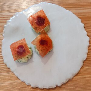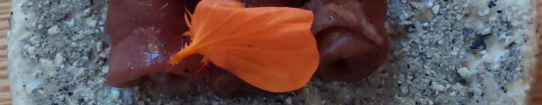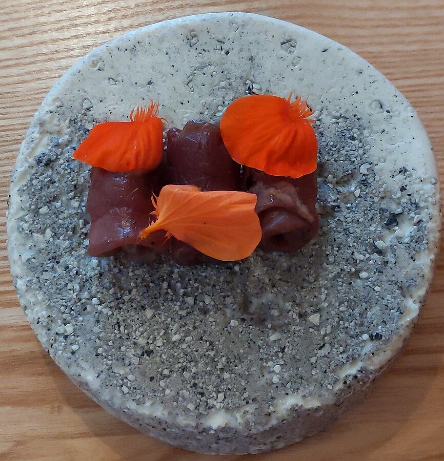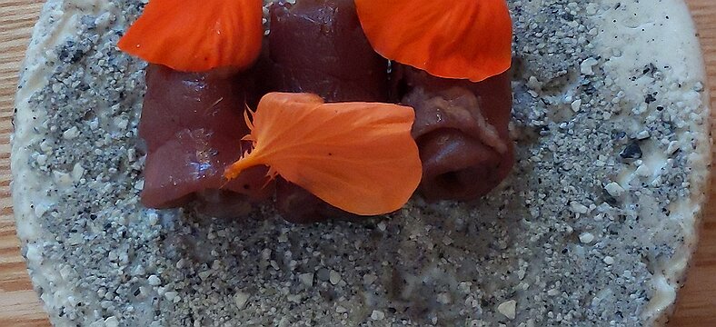 first fish course: marinaded mackerel barbecued on spruce with cauliflower