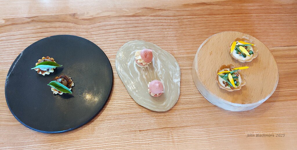 amuses bouche: lentil flour tartlet with aubergine purée and lemony leaf, beetroot meringue and foie gras cream, spelt tartlet with crème fraiche and garden herbs