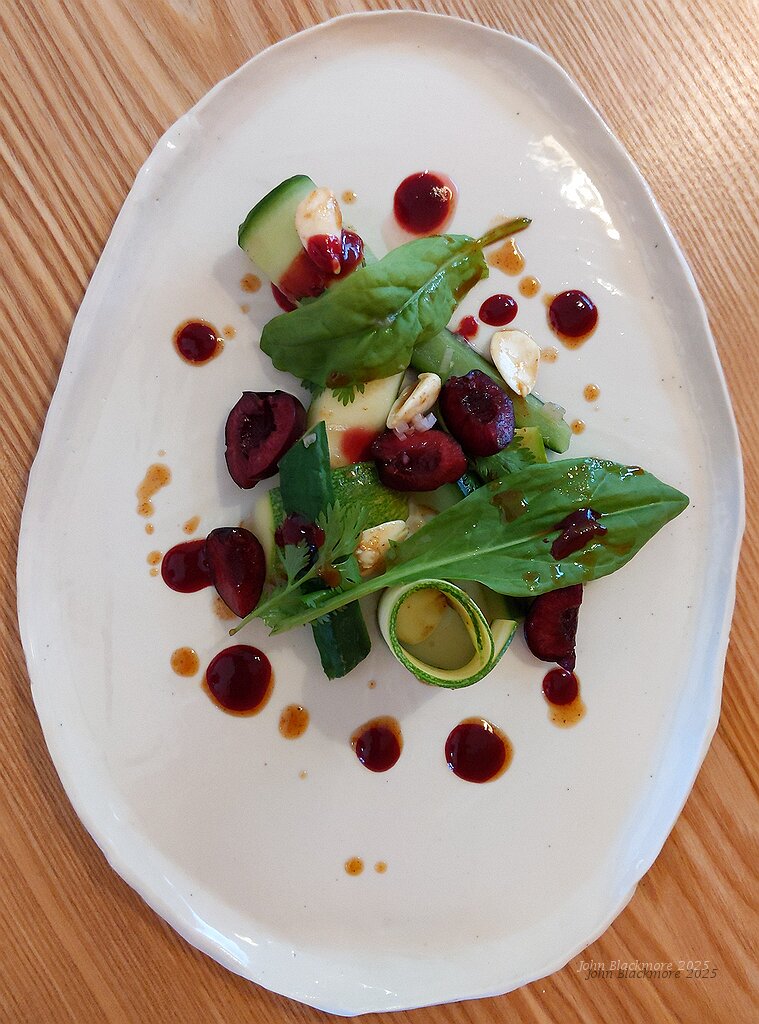 second vegetable course: courgettes, cherries, coriander, sorrel, fresh almonds