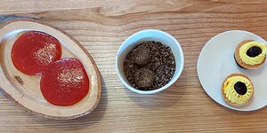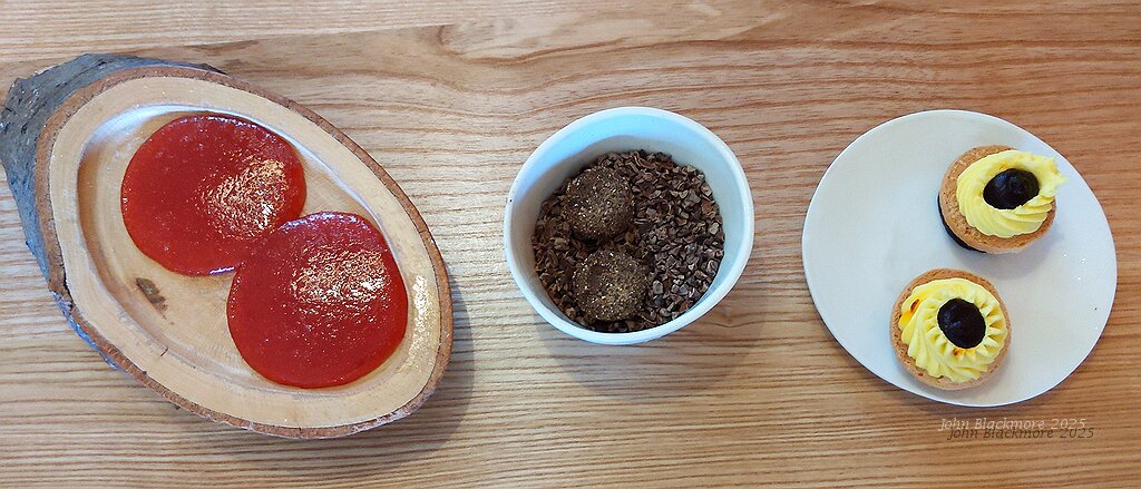 mignardises: red pepper jam; chocolate; Nancy macaroon with cherry and saffron cream