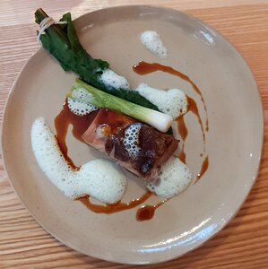 second meat course: pork shoulder low-temperature sous-vide cooked and barbecued, young onion and spinach