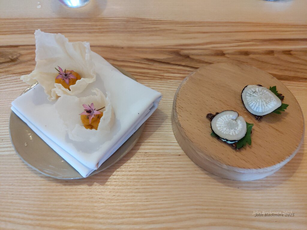 linseed biscuit, fromage frais, eel, black radish