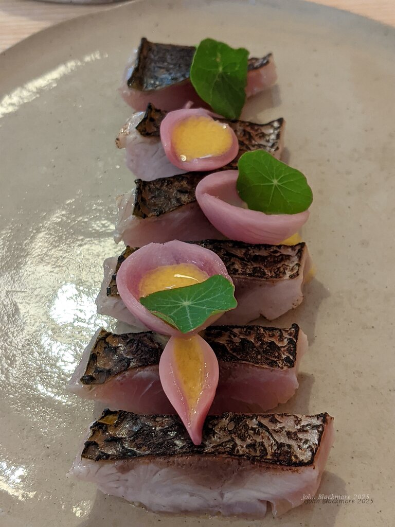 Mediterranean mullet, onions, egg, nasturtium leaves