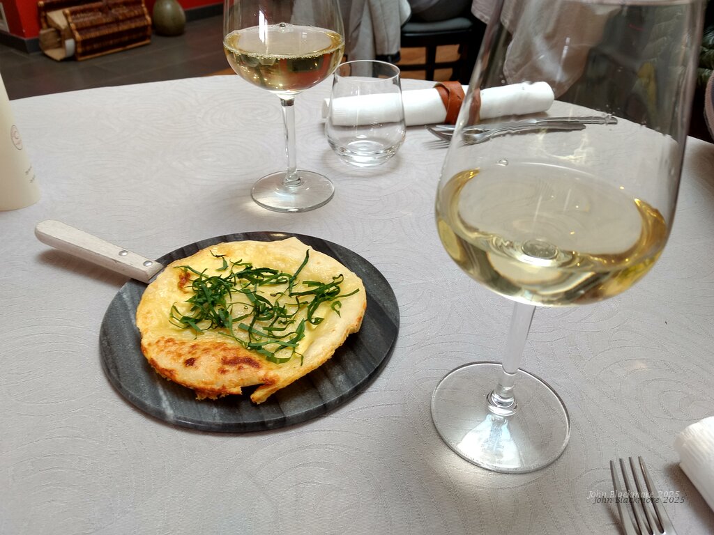 amuse bouche: La "fiouse" - ancestor of quiche Lorraine (no bacon or onion), bread base and fromage blanc. J.Mourat Père & Fils - IGP Val de Loire - OVNI Blanc