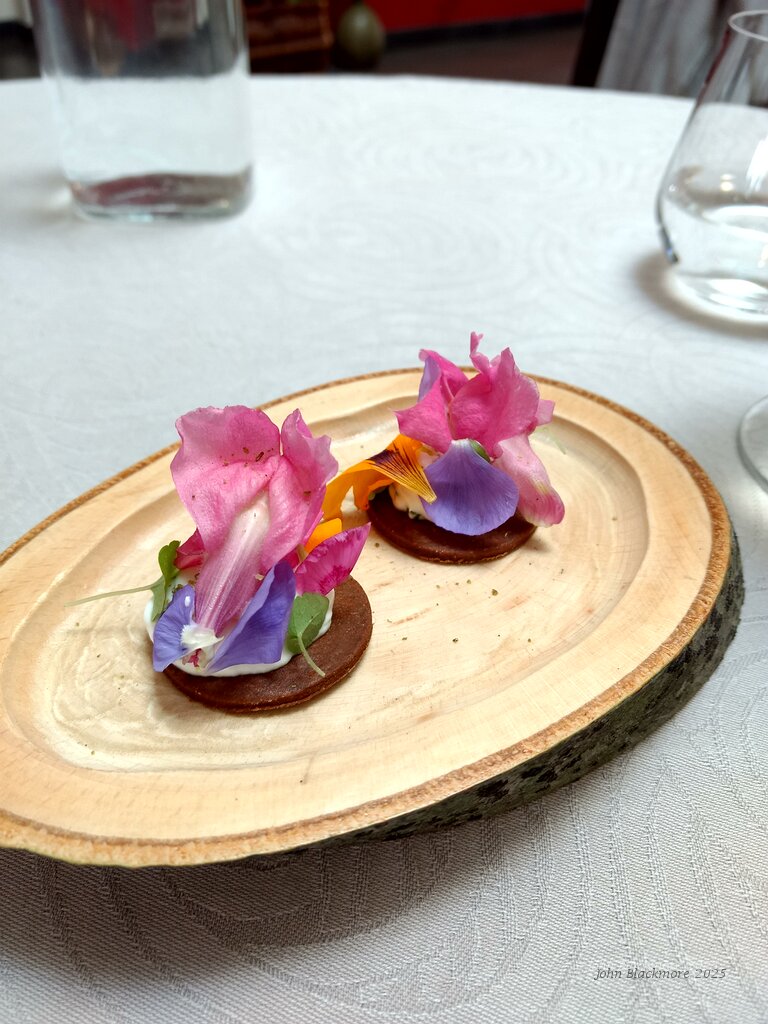 amuse bouche: Tartelette au sarrasin, bibeleskaes citronné, baie de Sancho et fleurs de printemps