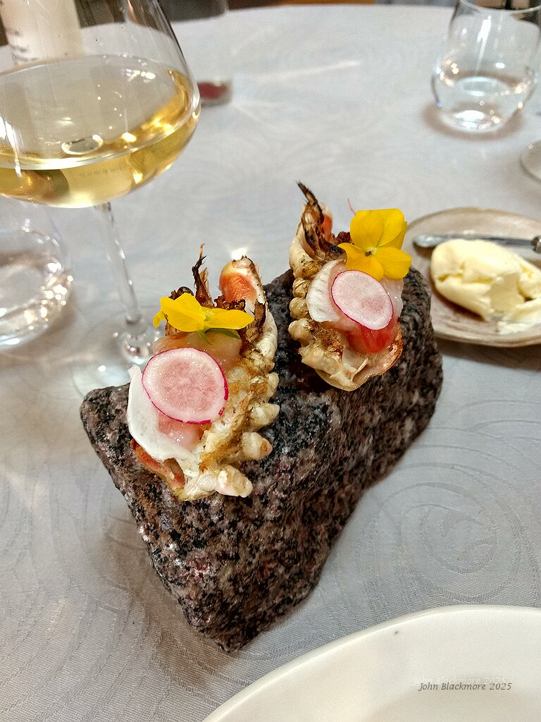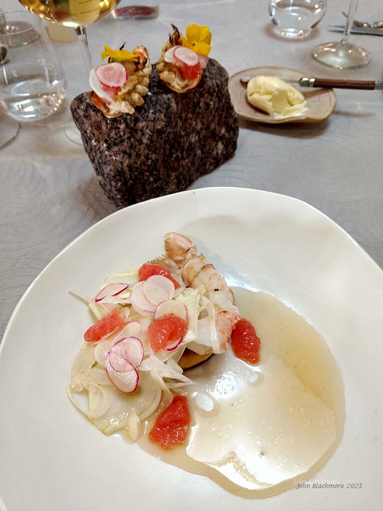 starter: foie gras with langoustine, fennel, radish and grapefruit