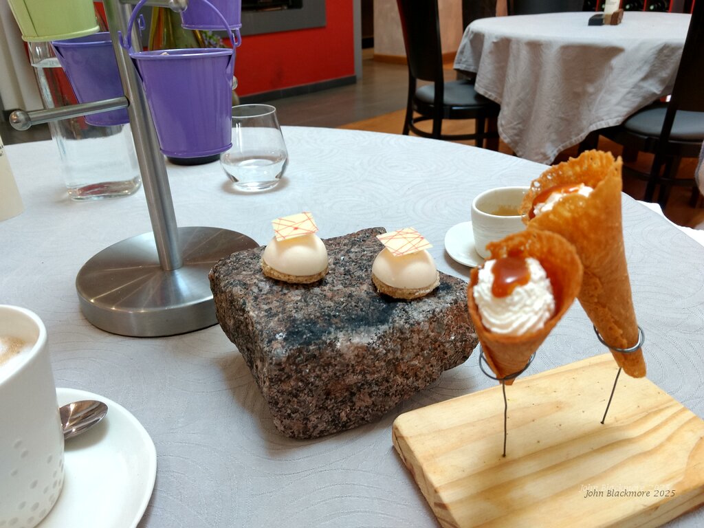 mignardises: nut and white chocolate and cones filled with chantilly cream and caramel