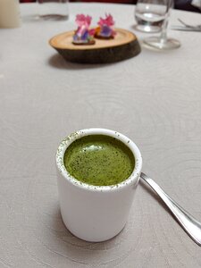 amuse bouche: asparagus in a green tea, radish top and potato cream