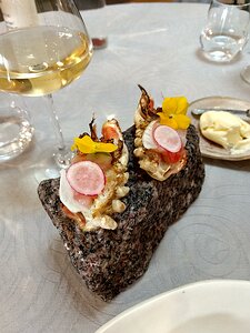 starter: foie gras with langoustine, fennel, radish, grapefruit