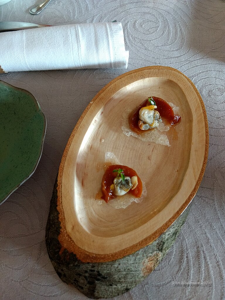 amuse bouche (3): rice crisp with marinaded apricot and cockle