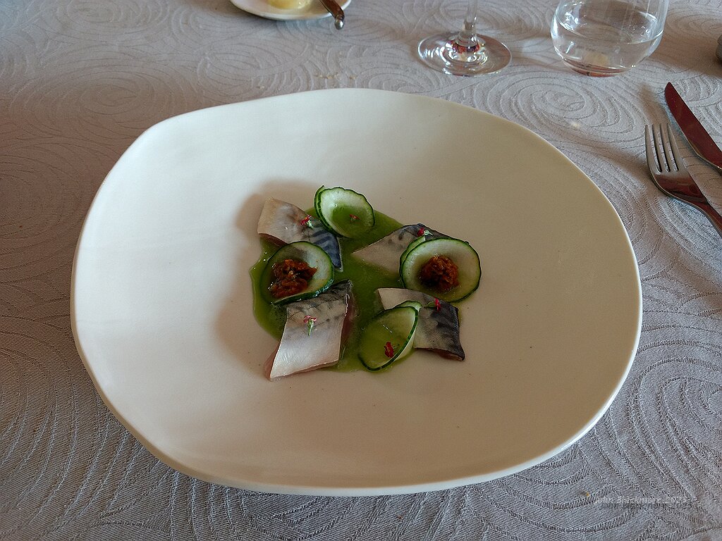 starter: marinaded mackerel, cucumber, kimchi with a cucumber and lime sauce
