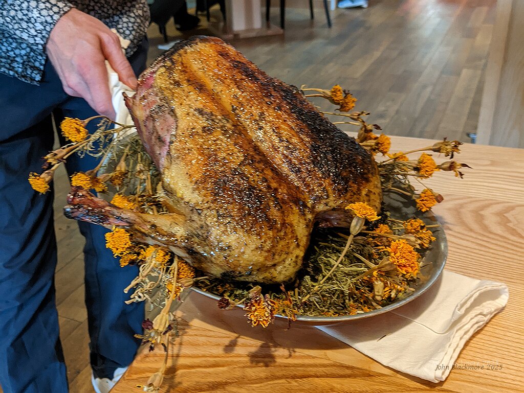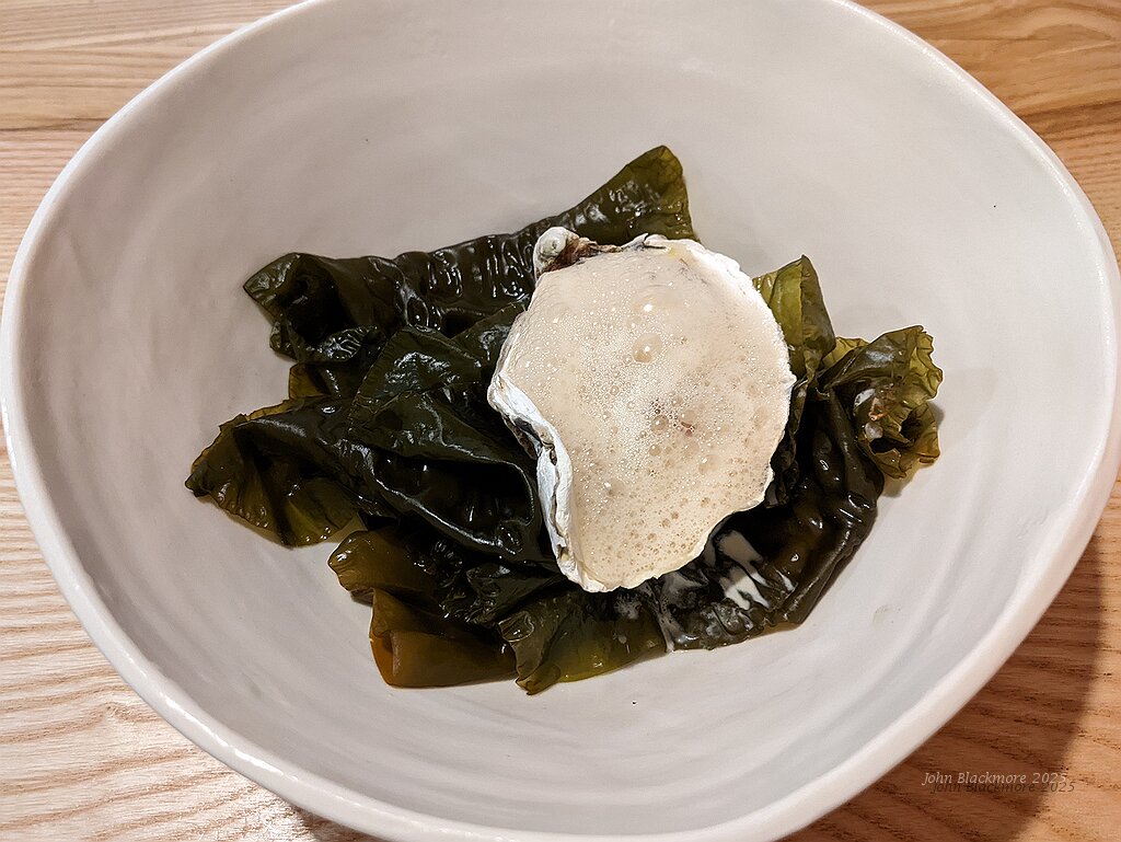 oyster from Camargue cooked over the fire with pear chunks and pear foam