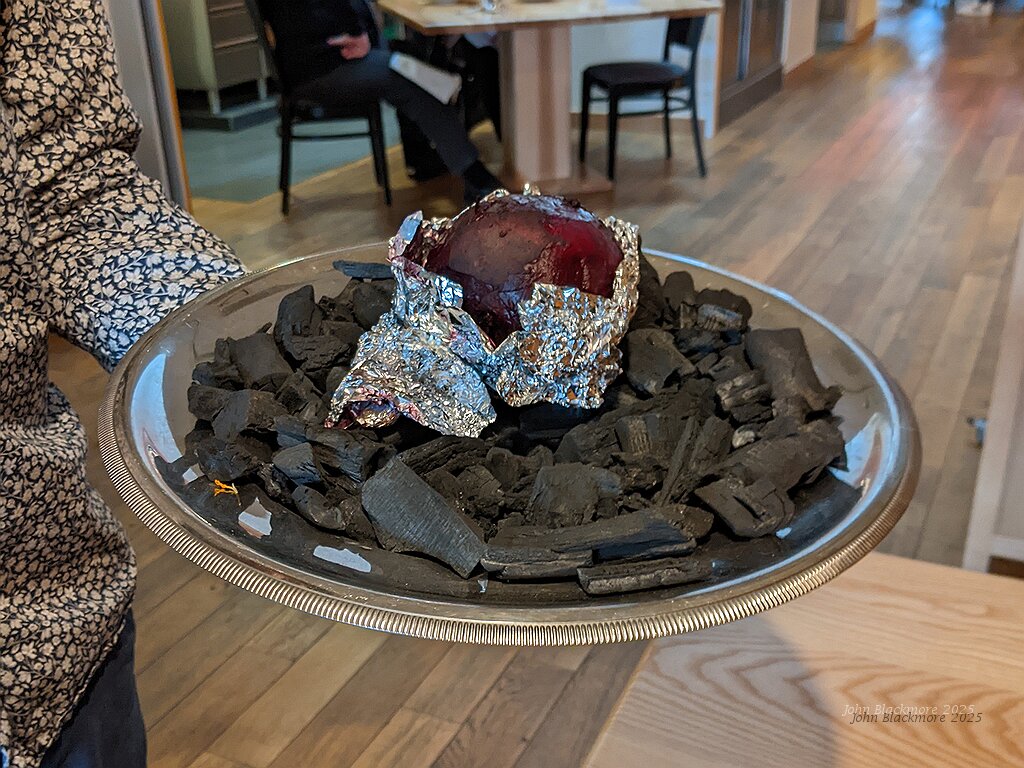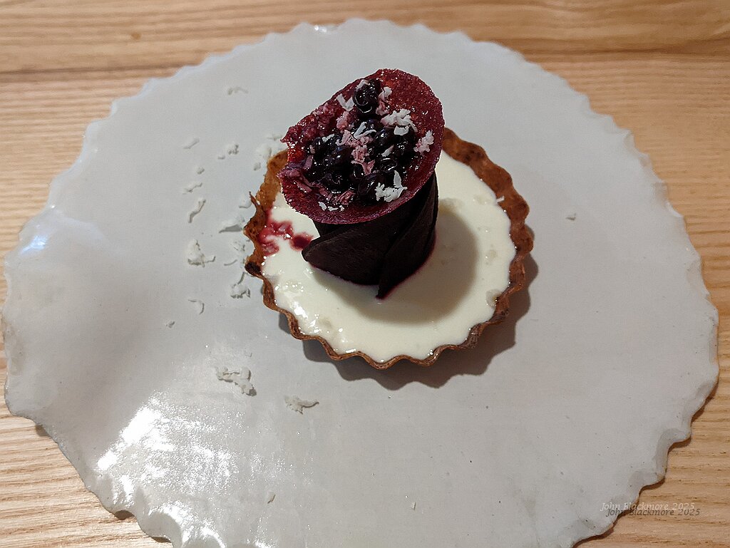 beetroot on horse radish yoghurt tart, elderberry tartlet and grated horseradish