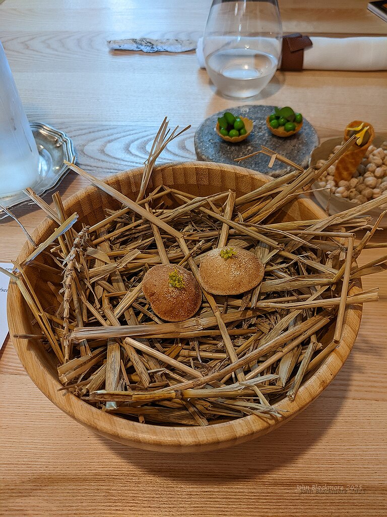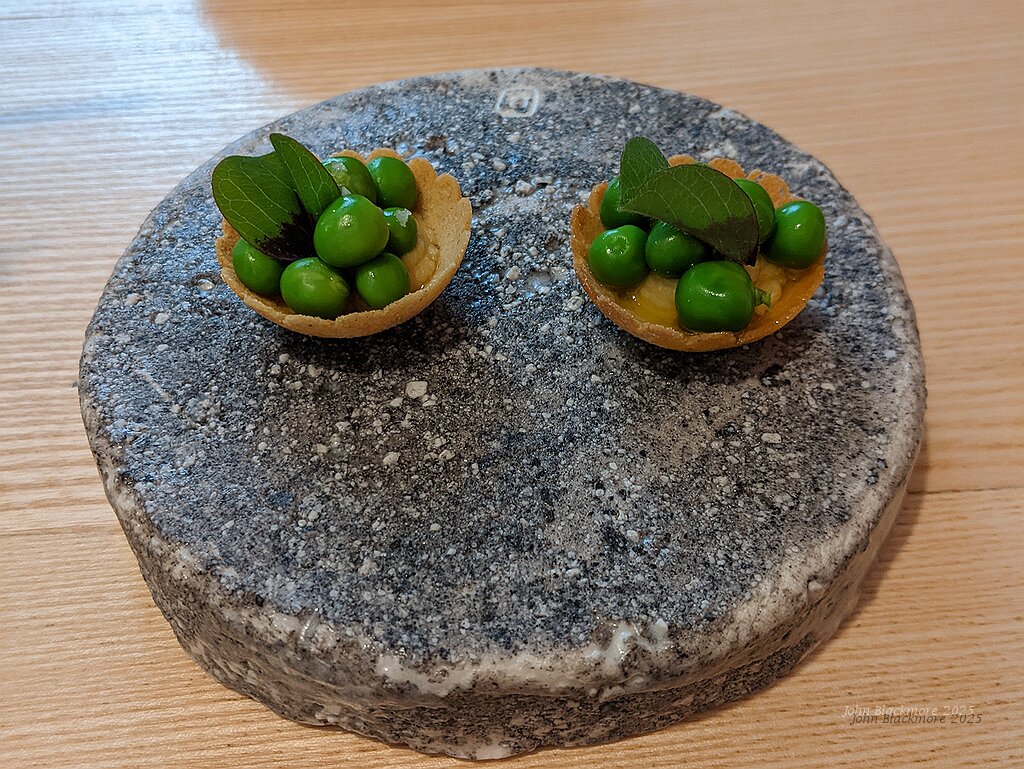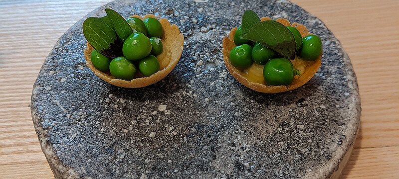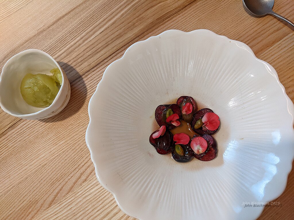 sea bass poached in butter, cockle, shellfish sauce, fire-roasted cucumber slice and cucumber foam