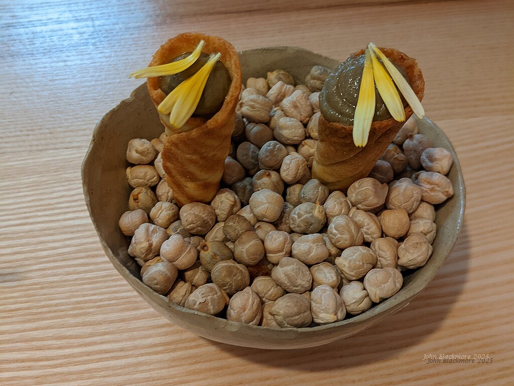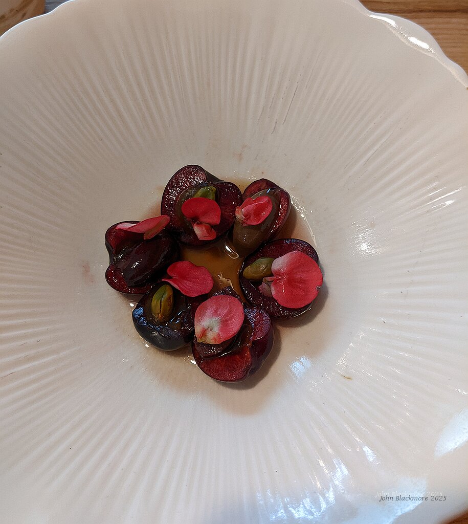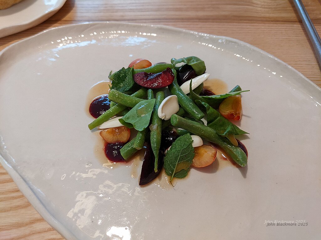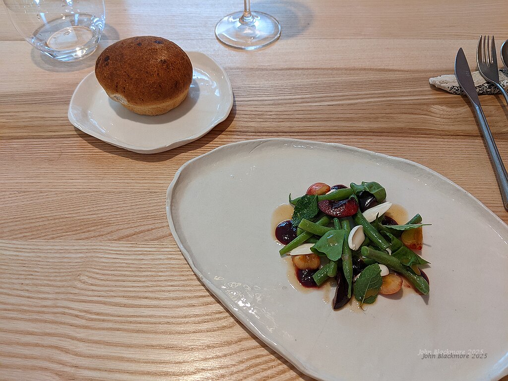 cherry, fresh Provence almond, bean and mint salad with a 50% lentil flour brioche bun