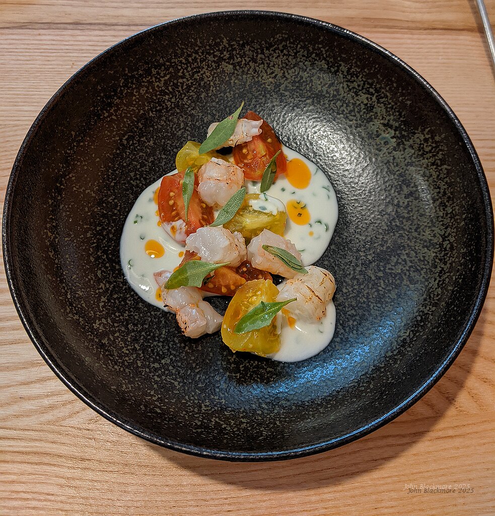 langoustine with oil made from langoustine heads, first home tomatoes, yoghurt and chives